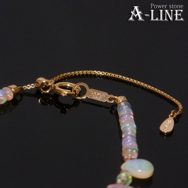 エチオピアンオパール(ペアシェイプ)&エチオピアンオパール(ボタン)3.5mm、ヘマタイト・ファセット(コーティング)金色2mm、SILVER925ひき輪&スライドアジャスター銀色、形状記憶超弾性ワイヤー、ワンプッシュ