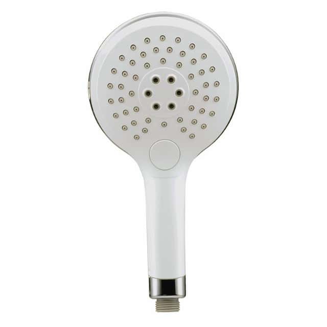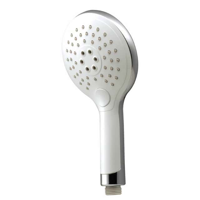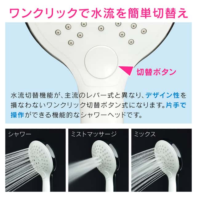 - 白とメッキのバイカラー色を取り入れた、デザイン性のあるボタン式の切替シャワーヘッドです。