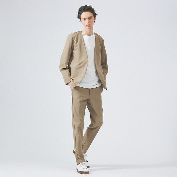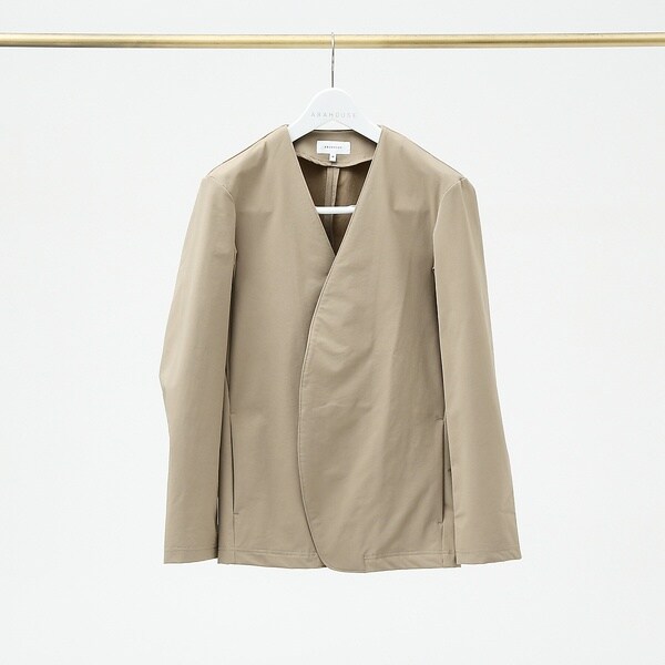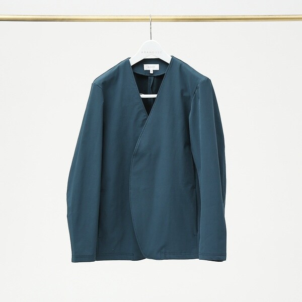 カラーレス・ボタンレスタイプで、カーディガンのようにも使えるジャケット。タイトながらマチをとることにより、動きやすい設計に。ピボットスリーブと呼ばれるハンティングジャケットのディティールを取り入れています。古くは狩猟用のジャケットの袖として、猟銃を構える際に動きを邪魔しないよう、腕の運動量を計算して開発されています。