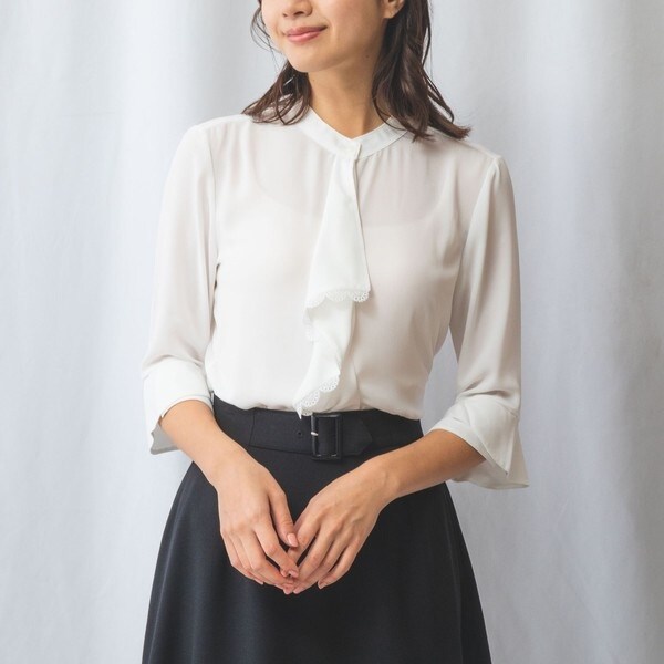 柔らかく波打つフリルが装いに華感をプラスするブラウス。縁取りの繊細なスカラップレースも女性らしい表情を演出してくれます。綺麗見えする軽やかなジョーゼット生地で品良くスタイリング出来るのも魅力のひとつ。オフィススタイルや卒園式・卒業式・入園式・入学式のフォーマルシーンにもおすすめです。