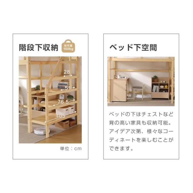 - 6畳の部屋に置きたくて購入しました。 発送も早く直ぐに届きました。 木の香りがして癒される感じがしました。 組み立ては説明書通りに見ていけば大丈夫ですが 手動では大変なので電動工具インパクト等が必要 な商品です。それでも数時間かかりました… でも仕上がりはとってもいいです! 階段もしっかりしていて不安はありません。 下の空間も大人が2人並んで座っても 余裕のある作りとなっているので 狭さや暗さを感じません。 おすすめです。