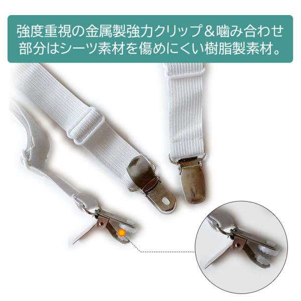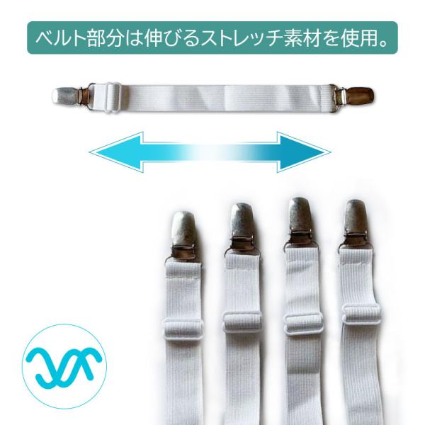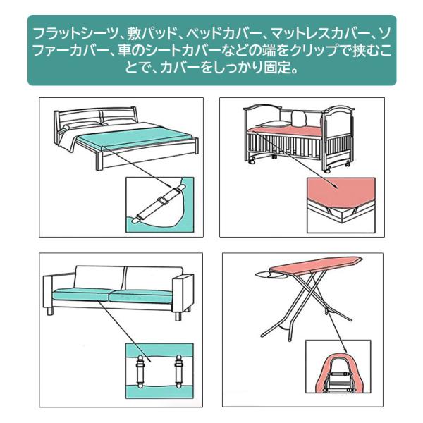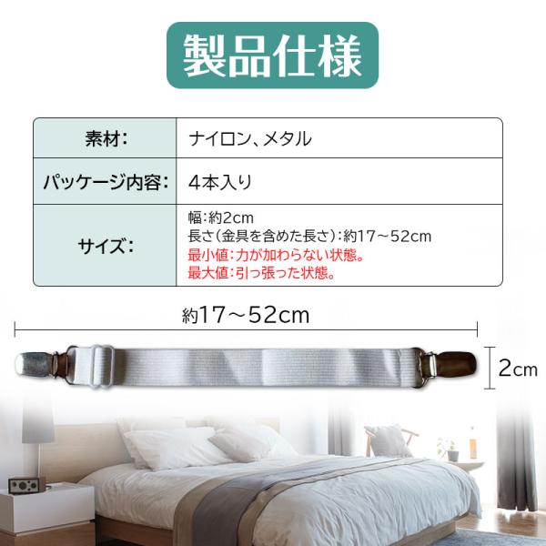 クリップでガッチリ挟み込んでベッドシーツがズレにくくなるシーツ固定ゴムバンド!シーツの乱れを防ぎ、清潔感を保持する必須アイテム!ベッドシーツの四隅を裏側からしっかり固定、ズレを防止!伸縮シーツ固定ゴムバンド4本セット!強度重視の金属製強力クリップ&噛み合わせ部分はシーツ素材を傷めにくい樹脂製素材。ベルト部分は伸びるストレッチ素材を使用。長さ調整も可能なため、様々なシーンで大活躍!フラットシーツ、敷パッド、ベッドカバー、マットレスカバー、ソファーカバー、車のシートカバーなどの端をクリップで挟むことで、カバーをしっかり固定。
