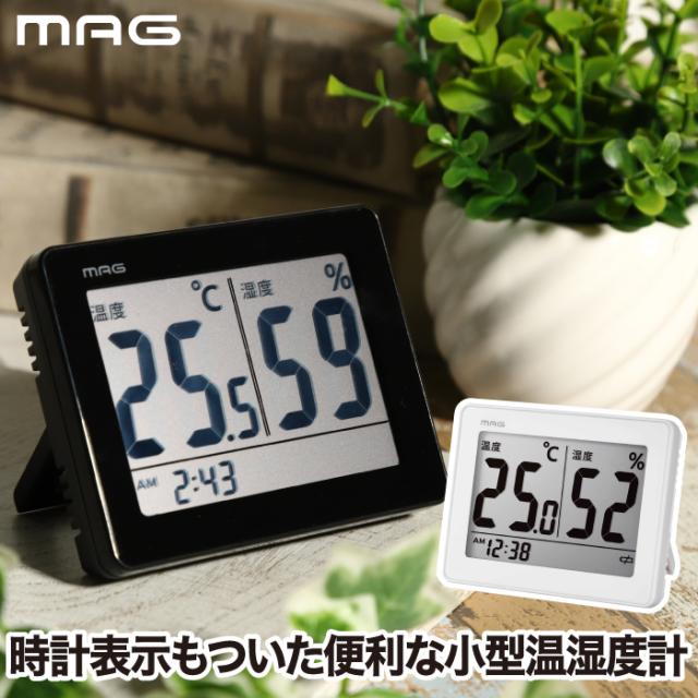 【商品タイトル】:MAGスカイデジタル温湿度計 | 小型・コンパクトサイズ | 温度・湿度・時計一体型 | 視認性良好デジタル表示 | 電池交換お知らせ機能付 | 置き時計・掛け時計兼用 | 在宅勤務・新生活・感染症対策に最適 | ブラック・ホワイト | 体調管理・環境整備に