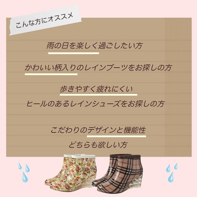 こんな方におすすめ | ・雨の日を楽しく過ごしたい方 ・かわいい柄入りのレインブーツをお探しの方 ・歩きやすく疲れにくい ヒールのあるレインシューズをお探しの方 ・こだわりのデザインと機能性 どちらも欲しい方 |