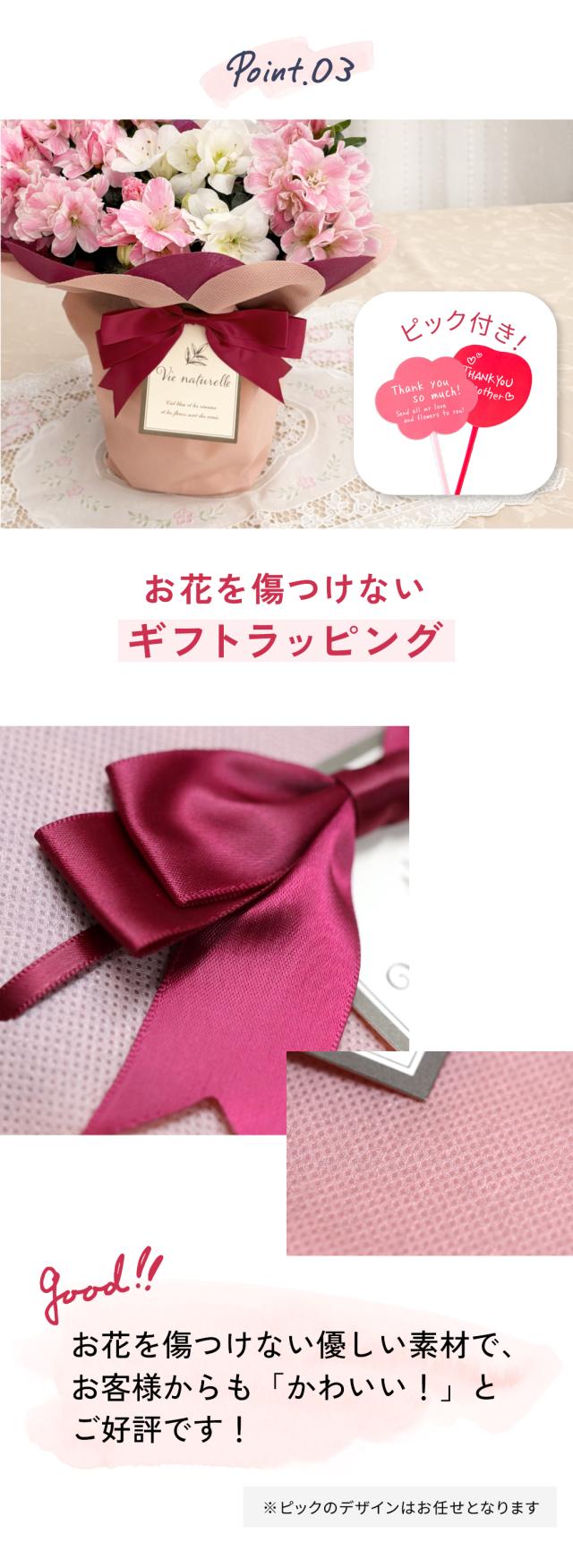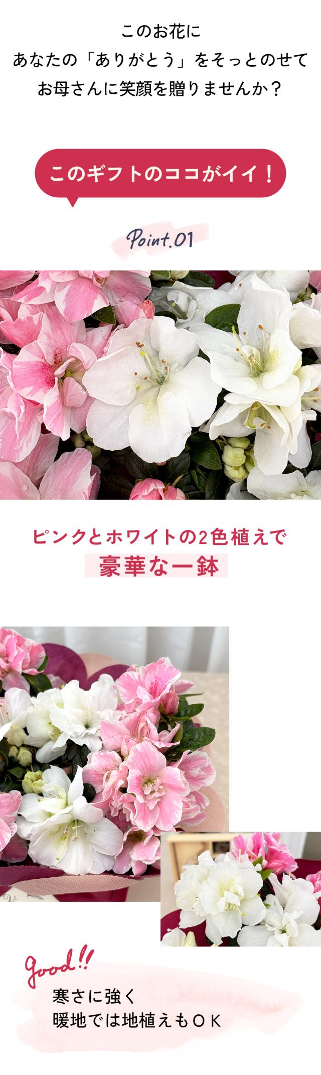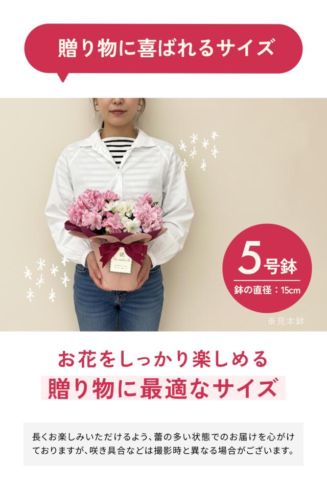 - 初めて母の日ギフトとして購入させていただきました。 商品イメージと同じラッピングでキレイに包装されていましたが、商品イメージよりも多く開花しておりダンボール箱の内側と花びらが輸送中の振動で擦れており外側の花びらが傷んでボロボロでした… あらかじめ鉢の大きさや高さで梱包ダンボールを決めて発送しているようですが、開花状況に応じて低木なので高さが低く横幅が大きいダンボールに入れていただきたかったです。 花はピンクとホワイトが絡まれておりミックスで彩りが非常に可愛いかったです。 ショップに連絡して代替品を送っていただきましたが再送のものは横幅が大きい箱に入れてくださったのですがサイズがギリギリで少し傷んでました。
