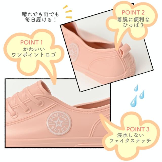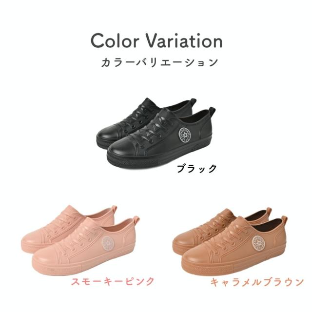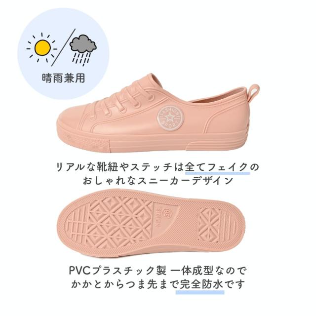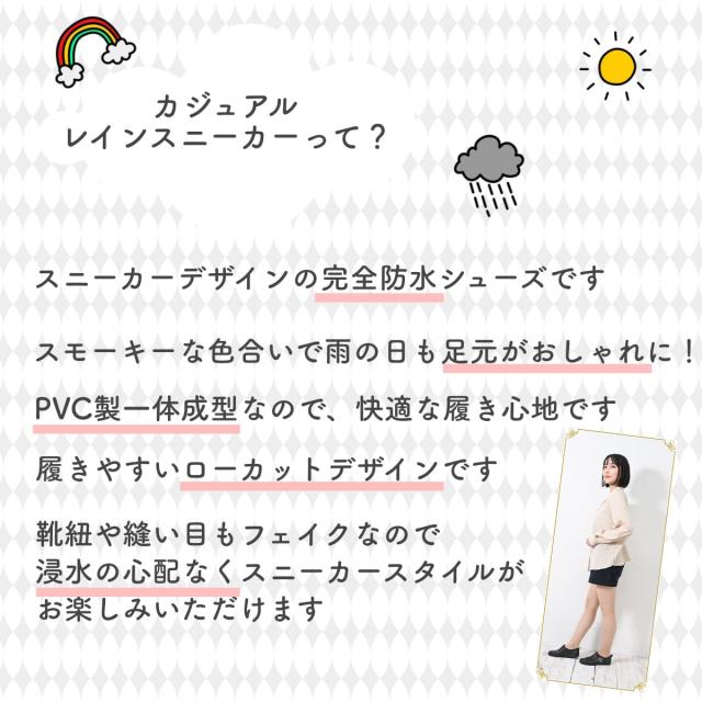 商品説明 | ・スニーカーデザインの完全防水シューズです ・スモーキーな色合いで雨の日も足元がおしゃれに! ・靴紐や縫い目もフェイクなので浸水の心配なくスニーカースタイルがお楽しみいただけます ・履きやすいローカットデザインです ・PVC製一体型の作りで、快適な履き心地です |