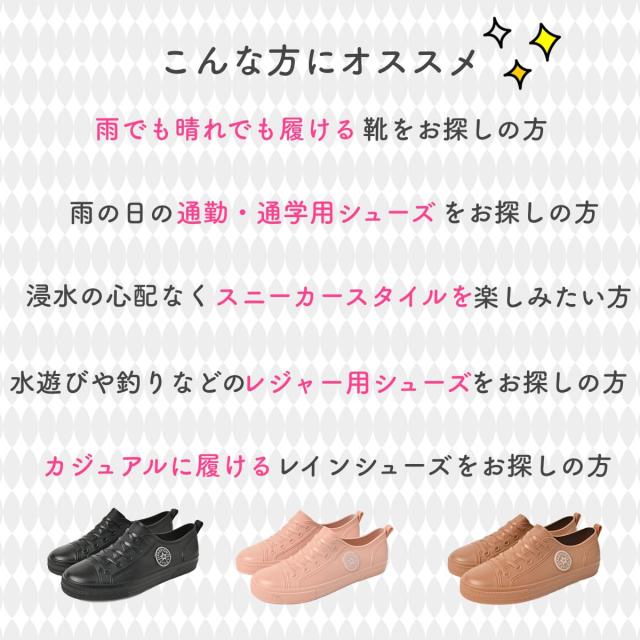 こんな方におすすめ | ・雨でも晴れでも履ける靴をお探しの方 ・浸水の心配なくスニーカースタイルを楽しみたい方 ・雨の日の通勤・通学用シューズをお探しの方 ・水遊びや釣りなどのレジャー用シューズをお探しの方 ・カジュアルに履けるレインシューズをお探しの方 |