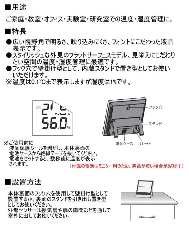 | 特徴 | 広い視野角で明るさ、映り込みにくさ、フォントにこだわった液晶表示です。 スタイリッシュな外見のフラットサーフェスモデル。 見栄えにこだわりたい空間の温度・湿度管理に最適です。 フック穴で壁掛け型として、内蔵スタンドで置き型としてお使いいただけます。 ※温度は0.1℃まで表示しますが湿度は1%単位です。 |