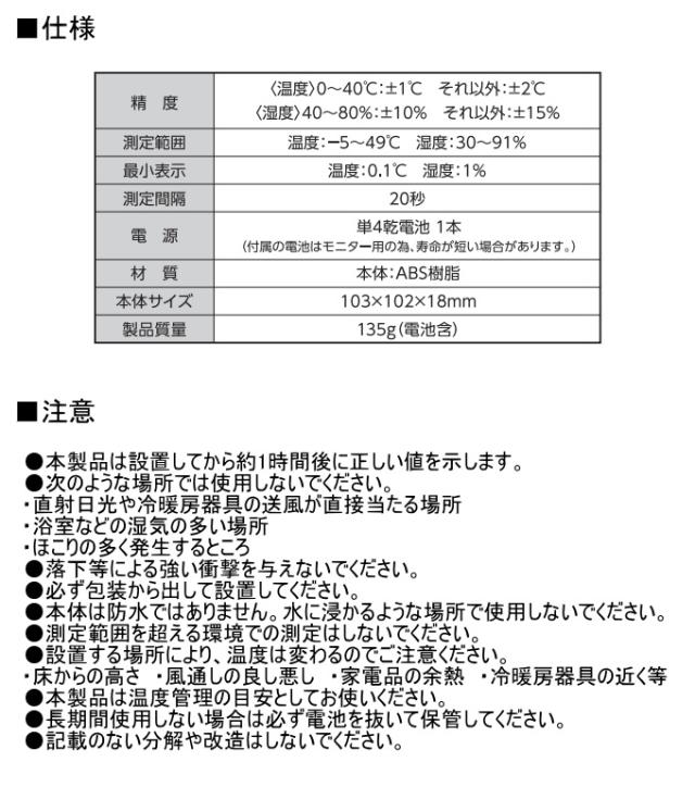 | 精度 | 温度:0〜40℃まで±1℃、それ以外±2℃ 湿度:40〜80%まで±10%、それ以外±15% |