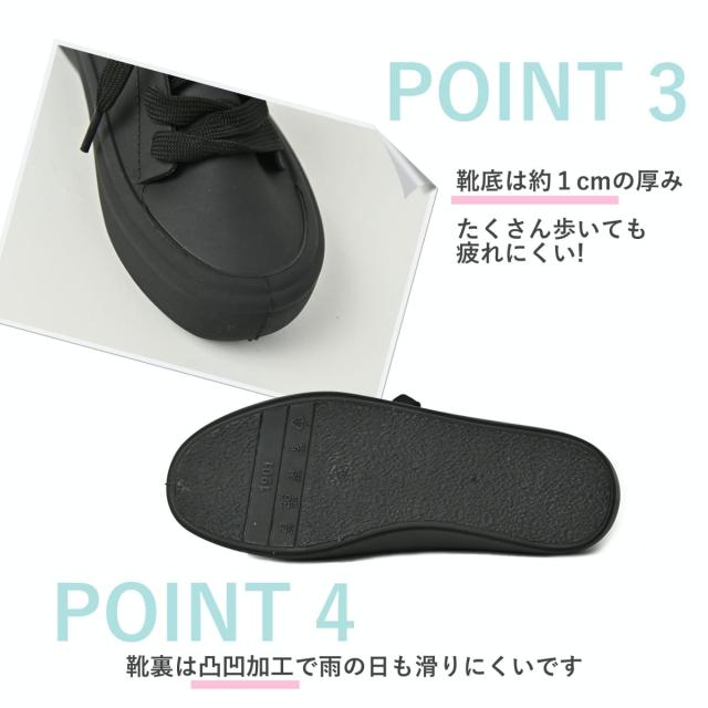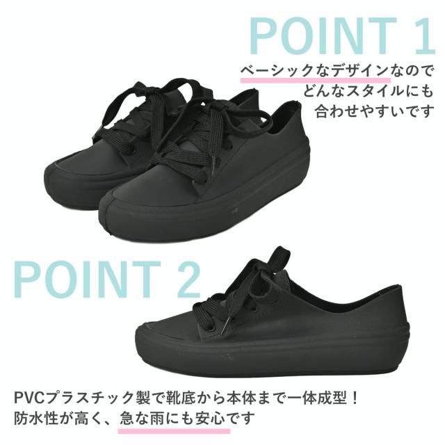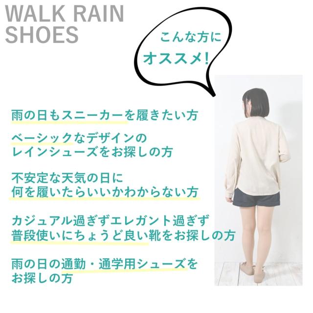 こんな方におすすめ | ・雨の日もスニーカーを履きたい方 ・ベーシックなデザインのレインシューズをお探しの方 ・不安定な天気の日に何を履いたらいいかわからない方 ・カジュアル過ぎずエレガント過ぎず 普段使いにちょうど良い靴をお探しの方 ・雨の日の通勤・通学用シューズをお探しの方 |