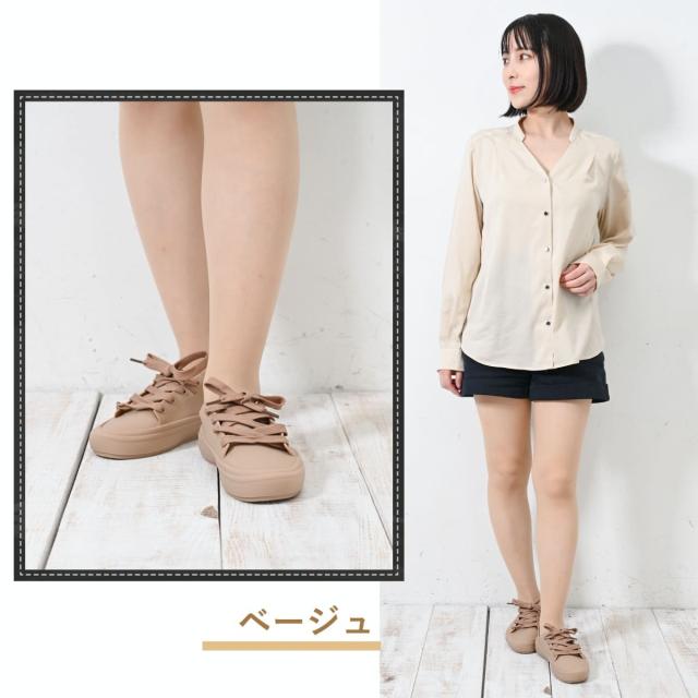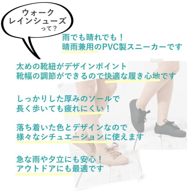 商品説明 | ・雨でも晴れでも 晴雨兼用のPVC製スニーカーです ・しっかりした厚みのソールで長く歩いても疲れにくい! ・太めの靴紐がデザインポイント!靴幅の調節ができるので快適な履き心地です ・落ち着いた色とデザインなので様々なシチュエーションに使えます ・急な雨や夕立にも安心!アウトドアにも最適です |