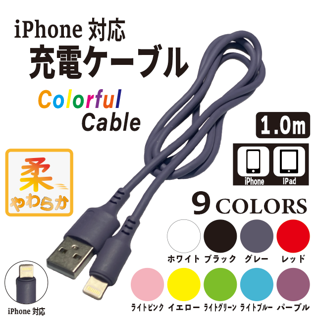 【 3本購入で+1本プレゼント! 】 カラフル iphone 対応 充電 ケーブル PVC 1m アイフォン【商品レビュー記入でポイント10%還元】