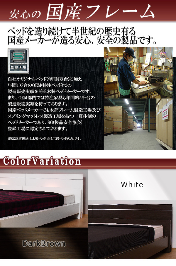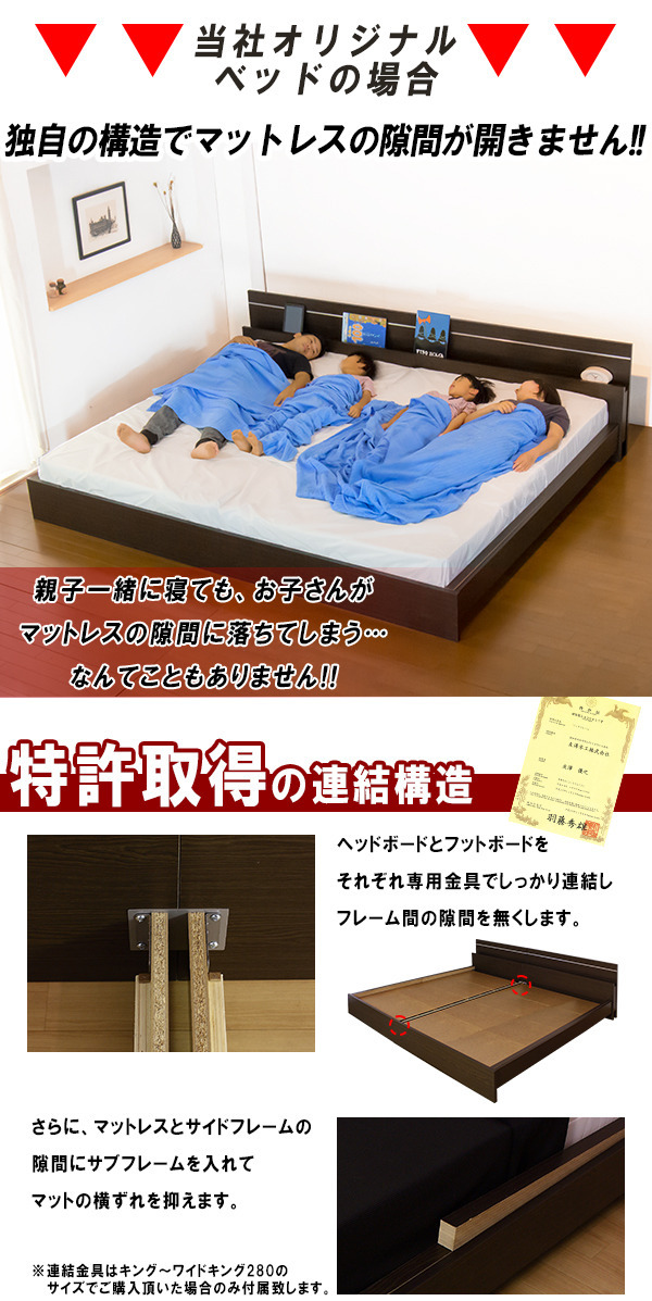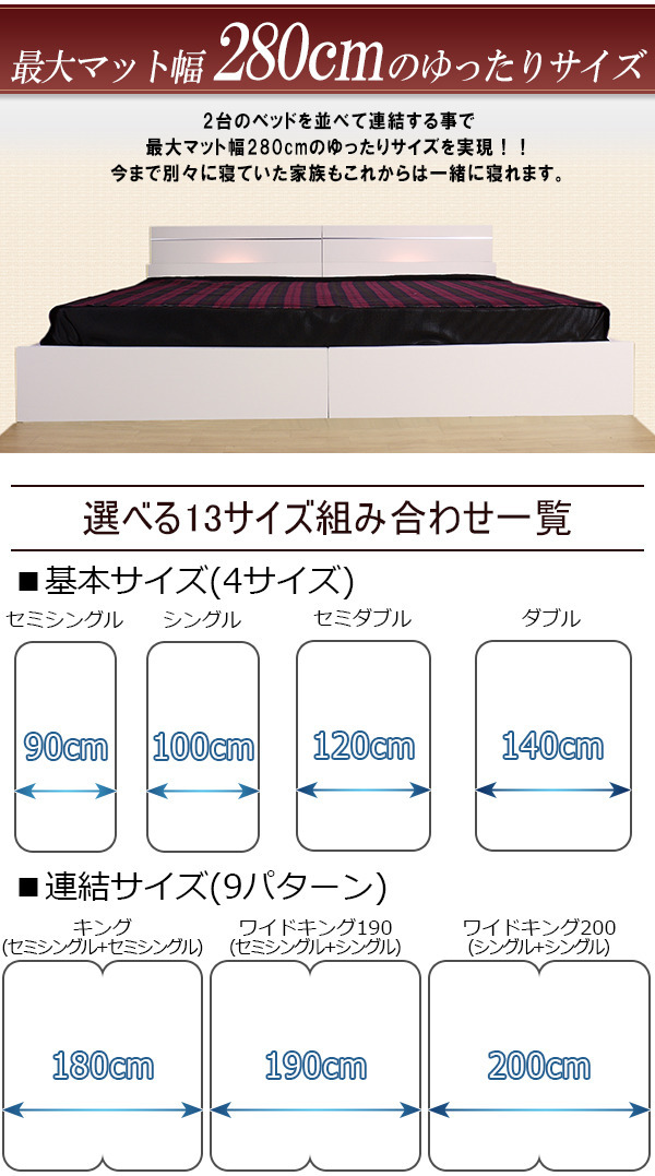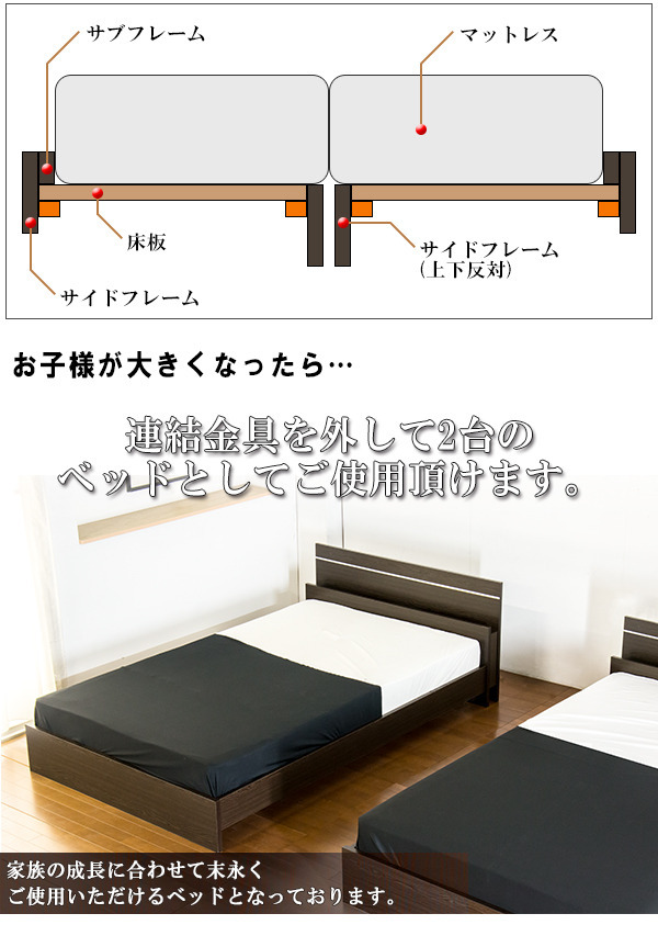 棚と照明付きデザインベッド 日本製ポケットコイルスプリングマットレス付き■商品説明■フレーム寸法/幅293×奥行208×高さ66cmMH約39cm■マットレス寸法/幅140+140×奥行195×高さ20cm■本体主材/プリント化粧板、白熱灯(10W)1灯■マットレス主材/1.9mmポケットコイルスプリング(コイル数750+750個)、ウレタンフォーム、抗菌・防臭フェルト、ポリエステル綿混合張地、両面多針キルティング加工■生産国本体/日本マットレス/日本※こちらの商品はお客様組立商品となります。※大型商品の為日時指定不可となります。