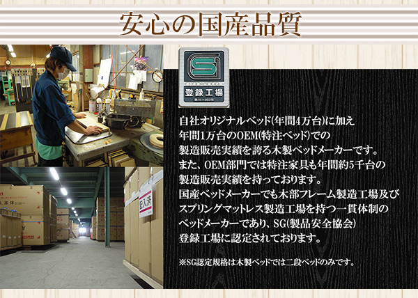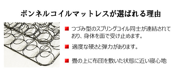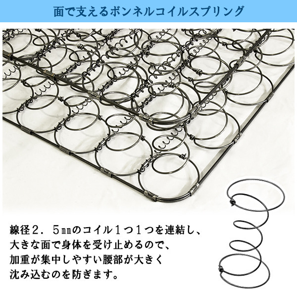 | 商品説明 | カントリー調デザインベッド セミダブル ボンネルコイルマットレス付き■商品説明■フレーム寸法/幅121×奥行215×高さ103cmMH約48.25cm■小引き出し内寸/W37.3×D8×H7.5、■マットレス寸法/幅120×奥行195×高さ17cm■本体主材/プリント化粧板、白熱灯(10W)2灯、1口コンセント(1200W)■マットレス主材/2.5mmボンネルコイルスプリング(コイル数264個)、ウレタンフォーム、フェルト、ポリエステル綿混合張地、両面多針キルティング加工■生産国本体/日本マットレス/中国※こちらの商品はお客様組立商品となります。※大型商品の為日時指定不可となります。 |