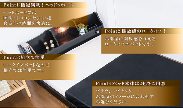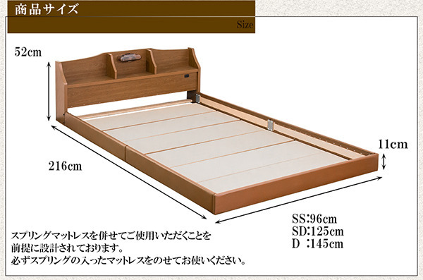 デザインフロアベッド セミダブル ポケットコイルマット付き■商品説明■フレーム寸法/幅125×奥行216×高さ52cmMH約19cm■マットレス寸法/幅120×奥行195×高さ17cm■本体主材/プリント化粧板、白熱灯(10W)1灯、1口コンセント(1200W)■マットレス主材/2.2mmポケットコイルスプリング(コイル数589個)、ウレタン、フェルト、ポリエステル、両面多針キルティング加工■生産国本体/日本マットレス/中国※こちらの商品はお客様組立商品となります。※大型商品の為日時指定不可となります。