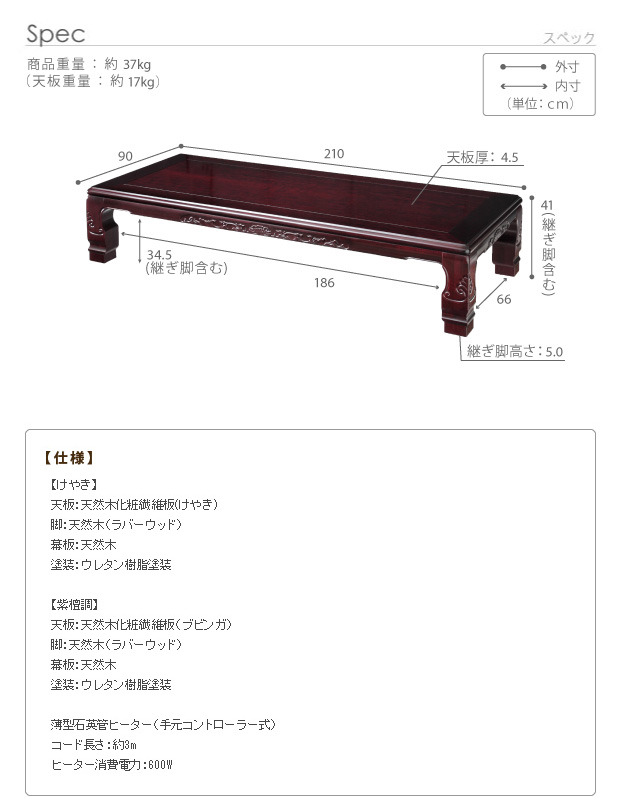 【カラー】けやき・紫檀調【仕様】[けやき/紫檀調]天板:天然木化粧繊維板(けやき/ブビンガ)脚部:天然木(ラバーウッド)薄型石英管ヒーター(600W・手元コントローラー式)◎一部組立品(脚部)【サイズ】幅210x奥行90x高さ約41cm(継脚5cm含む)重量:約37kg天板サイズ:幅210x奥行90・厚み4.5cm