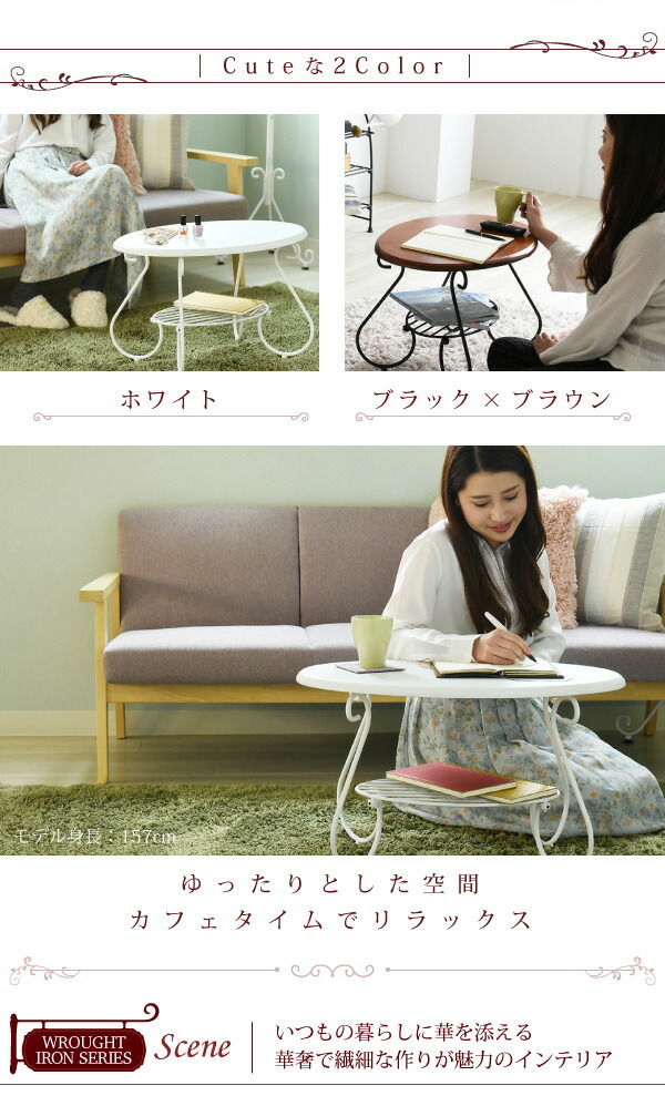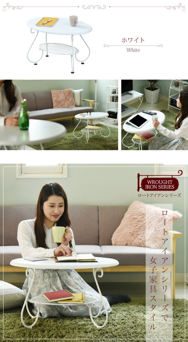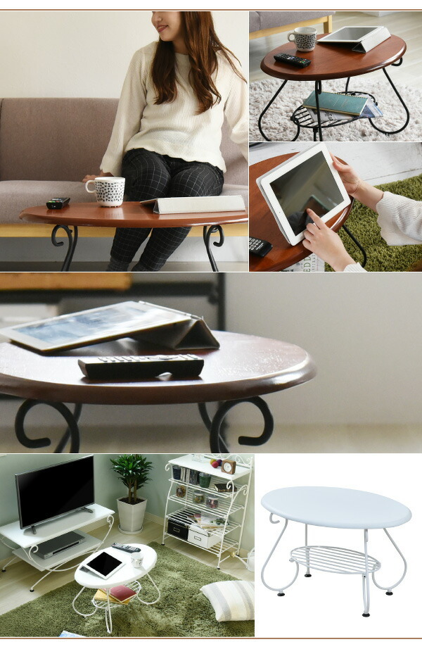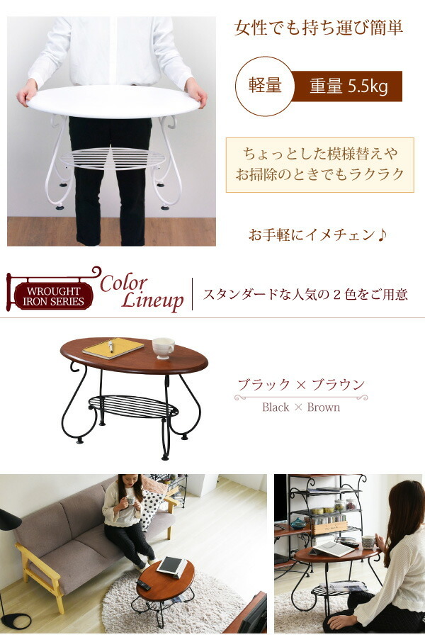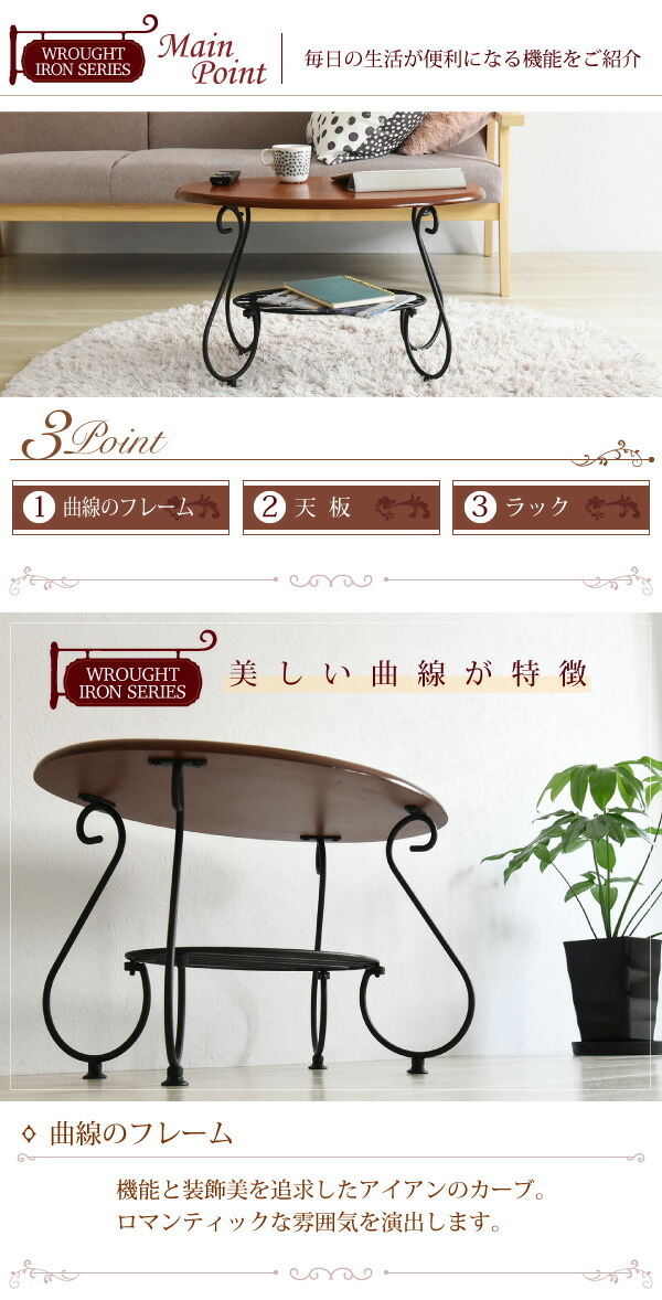 アイアンの装飾がクラシックなお部屋を演出するローテーブル。スチールと木が融合したおしゃれなロートアイアンシリーズ。楕円の形がお洒落で可愛いリビングテーブル。テーブルの下にはラックがついているので、雑誌やリモコンなどをサッと片づけることができます。・アジャスター付き・六角レンチ同梱・商品によって色味や木目などの風合いが異なります。