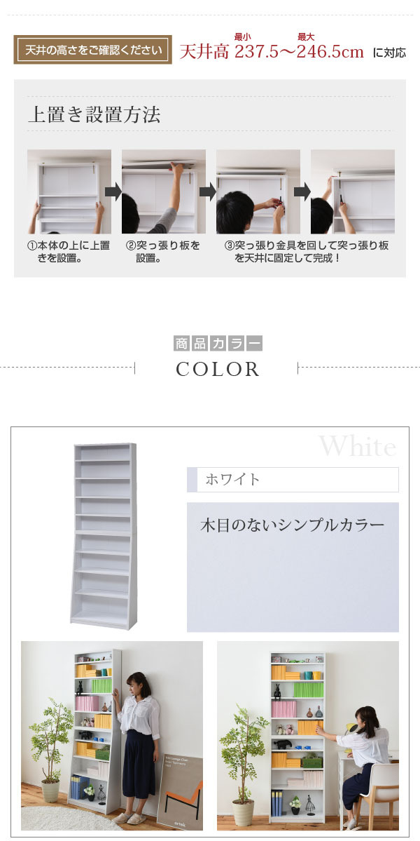 [外寸]幅60×奥行28×高さ180cm[内寸](オープン部上部)幅56×奥行14.5×高さ86cm(オープン部下部)幅56×奥行14.5〜25×高さ82.5cm(可動棚小)幅56×奥行14×厚み1.5cm(1cmピッチ上段63穴、下段31穴)(可動棚大)幅56×奥行17×厚み1.5cm(1cmピッチ40穴)収納量・耐荷重[可動棚]約5kg以下[収納量](文庫本)約333冊、(コミック)約296冊、(DVD)約296枚、(CD)約504枚、(Blu-ray)約344枚梱包サイズ(cm)幅(横)×奥行(縦)×高さ:?91×31.5×12.5?89×19×17梱包重量(?) :?11?9.3