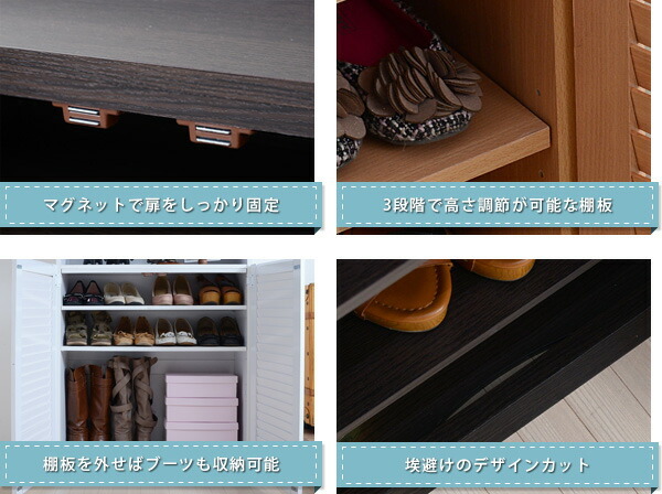 | 商品説明 | 本格的ルーバー扉を採用!ルーバーシューズボックスシリーズ。乾燥状態が保てる通気性にすぐれた扉を採用。75幅タイプのシングルタイプルーバーシューズボックス75幅のシングルタイプが登場。お部屋に合わせて色、サイズ、使い方が選べる便利なシューズボックスです。・推奨サイズ27cm以下 |