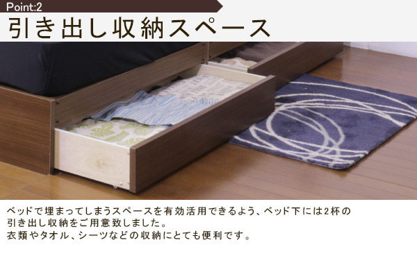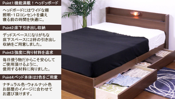 棚 照明 コンセント 引出付きベッド ダブル ボンネルコイルスプリングマットレス付■商品説明■フレーム寸法/幅137×奥行208×高さ70cmMH約42cm■引出し内寸/W約93×D約36×H約10cm 2杯■マットレス寸法/幅140×奥行195×高さ17cm■本体主材/プリント化粧板■マットレス主材/2.5mmボンネルコイルスプリング(コイル数312個)、ウレタンフォーム、フェルト、ポリエステル綿混合張地、両面多針キルティング加工■生産国本体/日本マットレス/中国※こちらの商品はお客様組立商品となります。※大型商品の為日時指定不可となります。