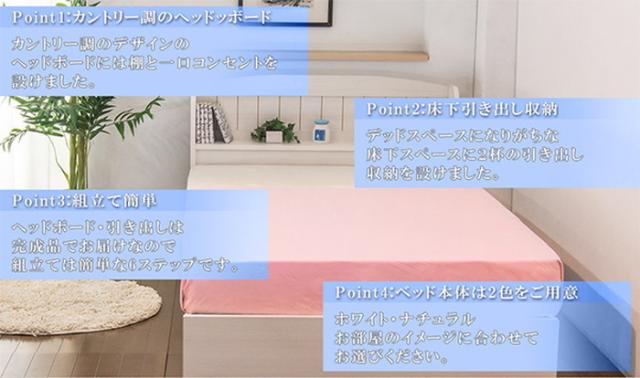 カントリー調引き出し付ベッド セミダブル ポケットコイルスプリングマットレス付■商品説明■フレーム寸法/幅120×奥行215×高さ79cmMH約43cm■引出し内寸/大:W約96×D約40×H約10cm、小:W約90×D約35×H約10cm■マットレス寸法/幅120×奥行195×高さ18cm■本体主材/プリント化粧板、1口コンセント(1200W)■マットレス主材/2.0mmポケットコイルスプリング(コイル数589個)、ウレタンフォーム、ポリエステル綿混合張地、両面多針キルティング加工■生産国本体/日本マットレス/中国※こちらの商品はお客様組立商品となります。※大型商品の為日時指定不可となります。