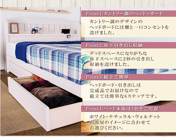 ベッド セミダブル 棚 コンセント 引き出し付き カントリー調 ポケットコイルスプリングマットレス付 to-10-a322-sd-108517 店舗 カフェ ラウンジ ロビー ホテル 法人 フレーム マットレスセット ベッド 送料無料 北欧 モダン 家具 インテリア ナチュラル テイスト 新生活