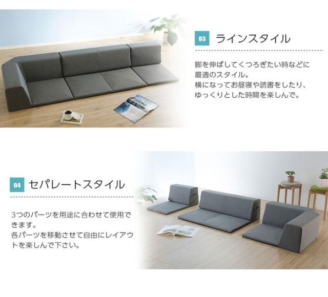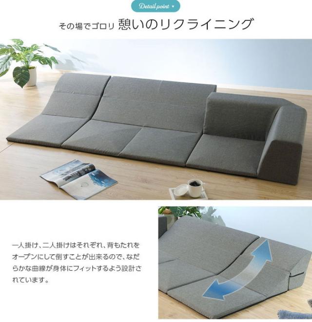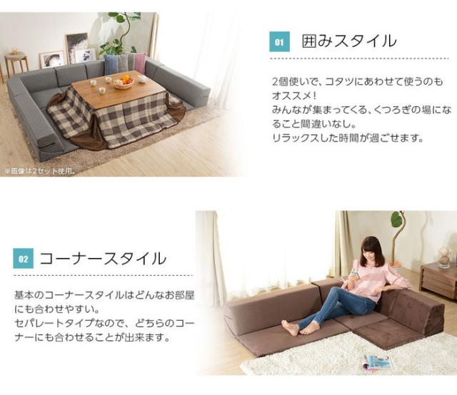 憩いのロースタイルでいつも楽しく温かい空間に。洗えるカバーリングで清潔に使える。組み合わせ自由で、レイアウトも楽しめる。一人掛け用、二人掛け用部分は背もたれを倒せるのでゆったりリラックスモードに。なだらかな曲線が体にフィットする開発者こだわりのデザイン。テレビを見るとき、読書をするとき、昼寝にも。極上タイムをご提案いたします。もちろんこたつとあわせてこたつソファにも大活躍です。
