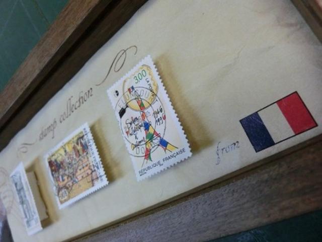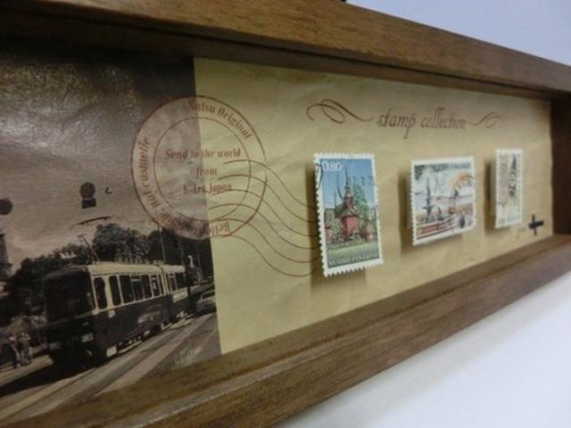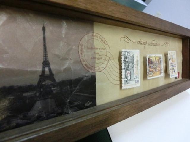 クシャクシャのクラフト紙に使用済の切手をレイアウトしたアンティーク仕上げのかわいいインテリア雑貨です。BOXタイプのフレームなので壁に飾るだけでなく、置いて飾ることもできます。玄関先にちょっと飾ったりすることもできるのでギフトにもおすすめです。
