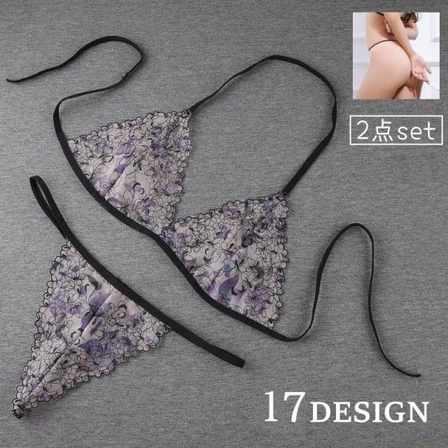 三角ブラ ショーツ 2点セット 上下セット レディース ランジェリー ノンワイヤー Tバック 紐パン 透け感 刺繍 花柄 セクシ