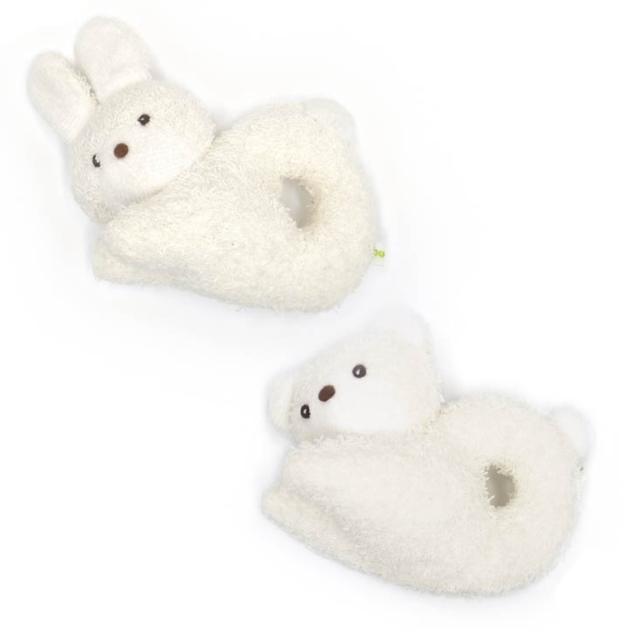 ママの肌の感触に似た柔らかくて、やさしいパイル生地のウサギとクマのガラガラです。安心の日本製で、何十年も知育玩具を作り続けている職人さんが、ひとつひとつ丁寧に仕上げています。赤ちゃんがにぎりやすいリングタイプでやさしい音色の鈴が入っています。出産祝いやプレゼントにもおすすめです。