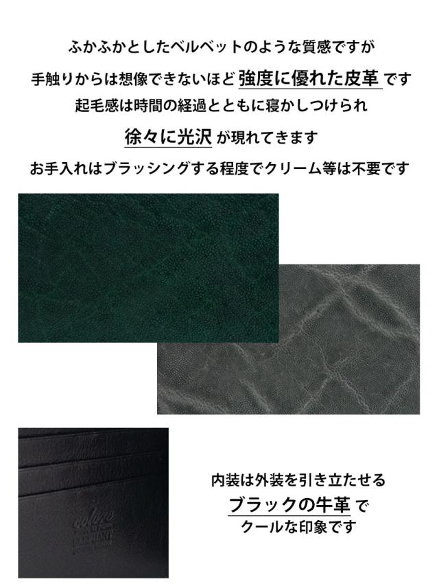 ■ふかふかとした質感ですが象なので強度に優れており、使っていくうちに光沢が現れてきます。内装は牛革(姫路レザー)を使っており、カード入れ等入れる量に合わせて馴染んでいってくれます