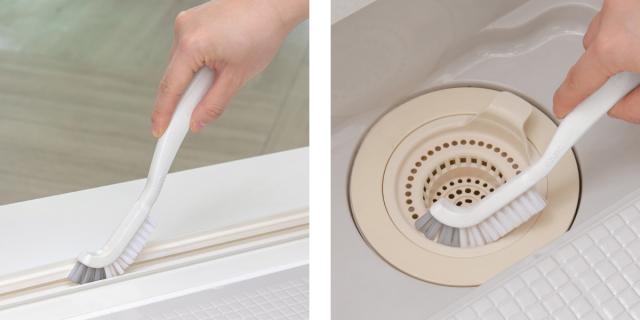 洗いにくい隅々までしっかり洗える薄型カーブ形状です。浴室の排水溝やドアレール、タイル目地や通気口、蛇口まわりなどの細かい隙間があるところのお掃除に最適です。