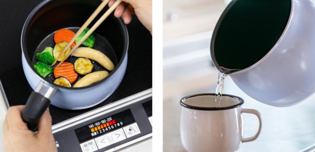 ケトルとお鍋を一体化したマルチポットです。「煮る・沸かす・炒める・焼く・揚げる・和える・茹でる」の7通りの調理が1台でできます。やかん、鍋、ボウルと増えがちな調理器具もマルチポットに集約すればキッチンがスッキリ片付きます。