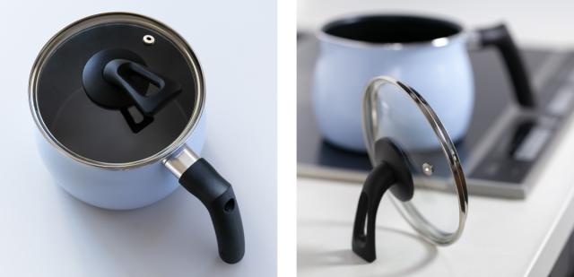 自立するガラス蓋は、調理中に立てて置くことができるので場所をとらず、調理中も調理後にも蓋を置く場所に困りません。限られた作業スペースを蓋が占拠することなく、広々と調理ができます。ガラス蓋なので中身が見やすく調理や保存の際に便利です。