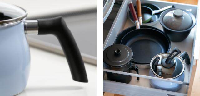 ハンドルが本体から離れて下向きに付いているので、持ちやすく、持った時にも熱さを感じにくいです。収納の際にも場所を取りません。