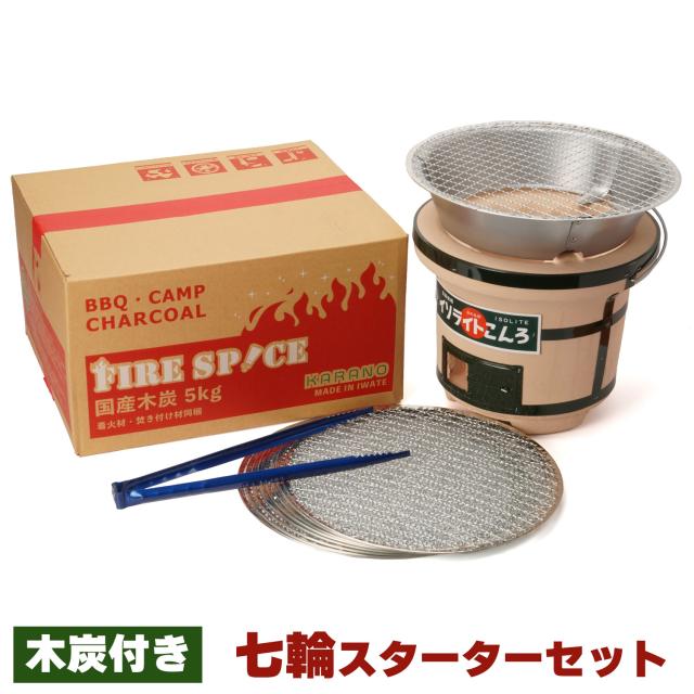 【しちりんセット】 国産七輪 スターターセット イソライトこんろ 国産なら木炭 着火材 焚付材 焼き網 炭ハサミ