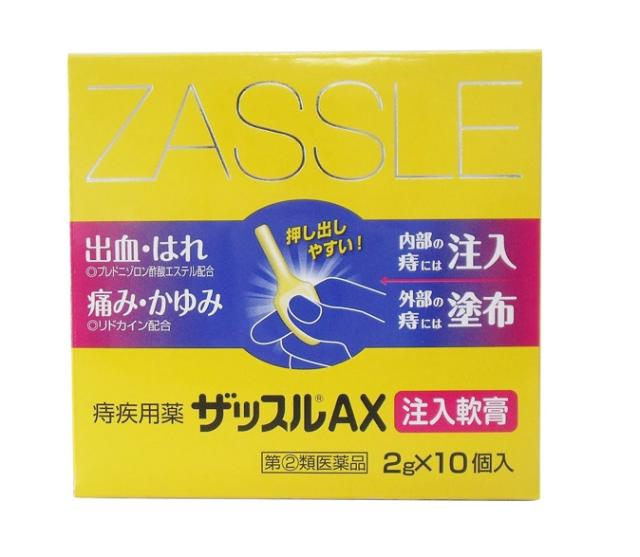 ●ザッスルAX注入軟膏は,激しい痔の痛み・かゆみ・出血等の諸症状に効果のある薬剤を配合した痔疾患の注入式軟膏です。