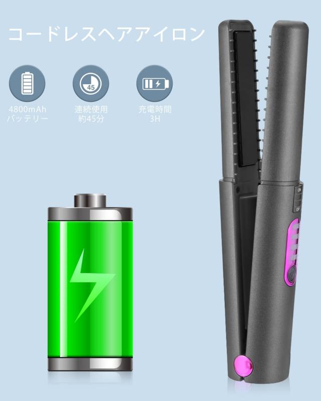【4800mAhの圧倒的な容量&連続45分使用可能】 コードレスヘアアイロンの中でトップクラスの4800mAh大容量バッテリーを内蔵。