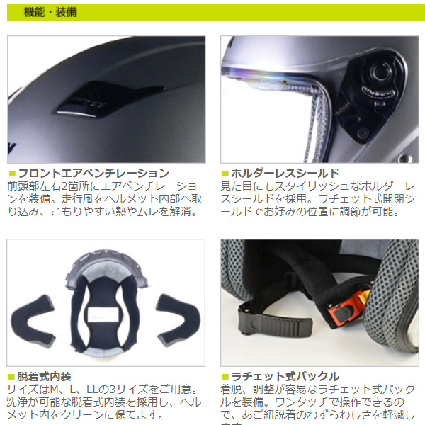 スタイリッシュなデザインは走行風によるヘルメットのリフトを抑えたエアロダイナミック設計。風の流れを意識したエアベンチレーション〜エアダクトは前頭部からヘルメット内部へ走行風を取り込み、後方から内部の熱を排出する高機能エアフローシステム。サイズはM、L、LLの3サイズをご用意。洗浄が可能な脱着式内装を採用でいつも清潔に保てます。