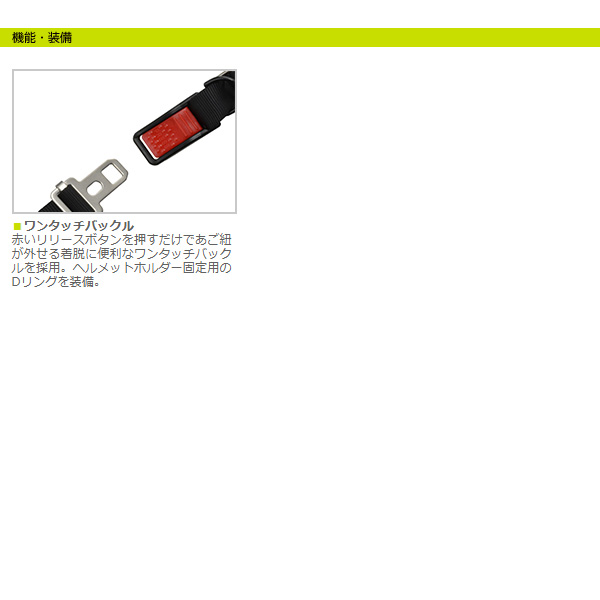 脱着に便利なワンタッチバックルに加え、ヘルメットホルダー固定用のDリングを装備。
