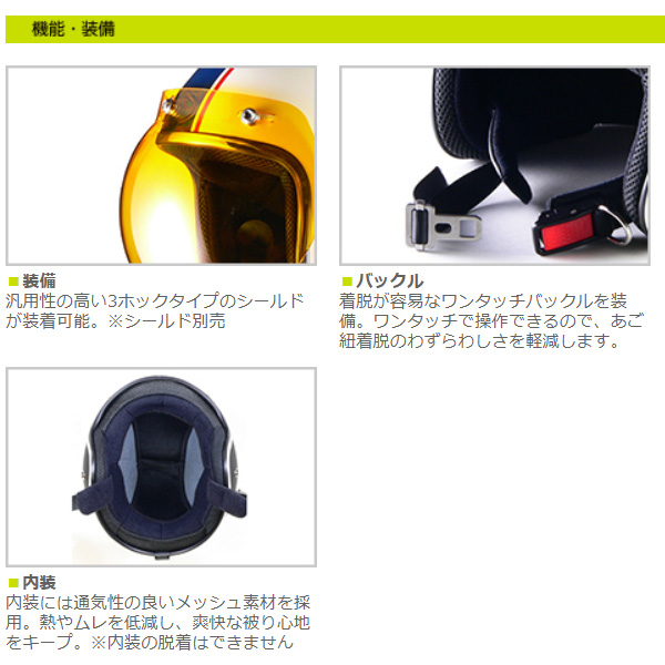幅広い層から支持を受けている定番のスモールジェット。フロントが3ホックタイプなので、シールドやバイザーの取り付けが可能。後頭部にゴーグルストラップを装備し、ゴーグルの使用が可能。着脱が容易なワンタッチバックルを装備。