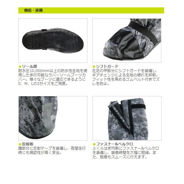 耐水圧10,000mm以上の防水性生地を使用した歩行可能なラバーソールブーツカバー。縫製部分はシームテープ処理で防水性がアップ。
