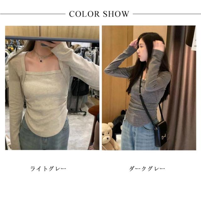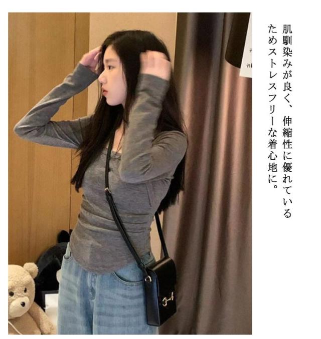 アシメトリー裾 トップス 春 冬 韓国風 長袖 レディース 重ね着風 秋 スクエアネック きれいめ 無地 ティシャツ ファッション インナー Tシャツ 大人可愛い グレー シンプル カジュアル かわいい カットソー