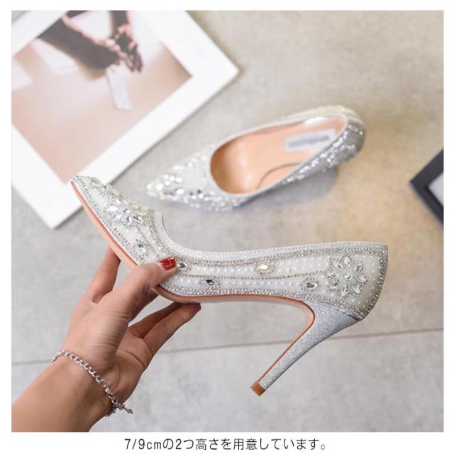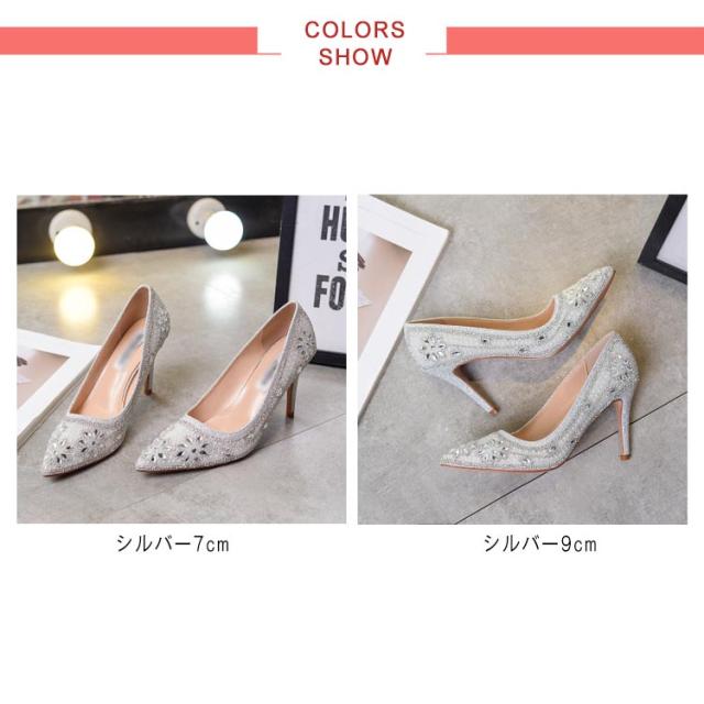| ウェディングドレスに!花嫁・二次会・結婚式・発表会・演奏会・披露宴・卒業式!結婚式にも、普段にも履けるタイプです。 デザインは見た目通り可愛く、キラキラも上品でした! あと履いた時に足というか立ち姿がキレイに見えるきがします! 上品なシルエットで美脚効果も期待できるハイヒール。 7/9cmの2つ高さを用意しています。 | |