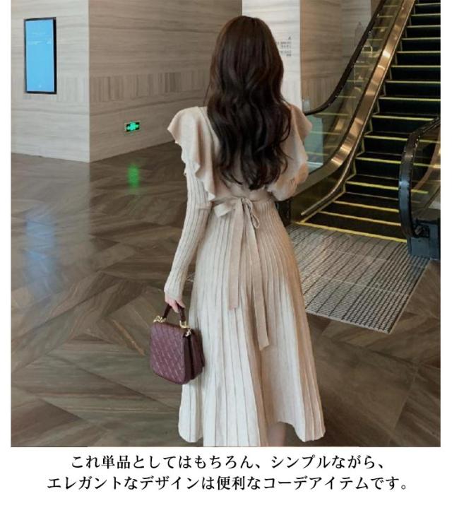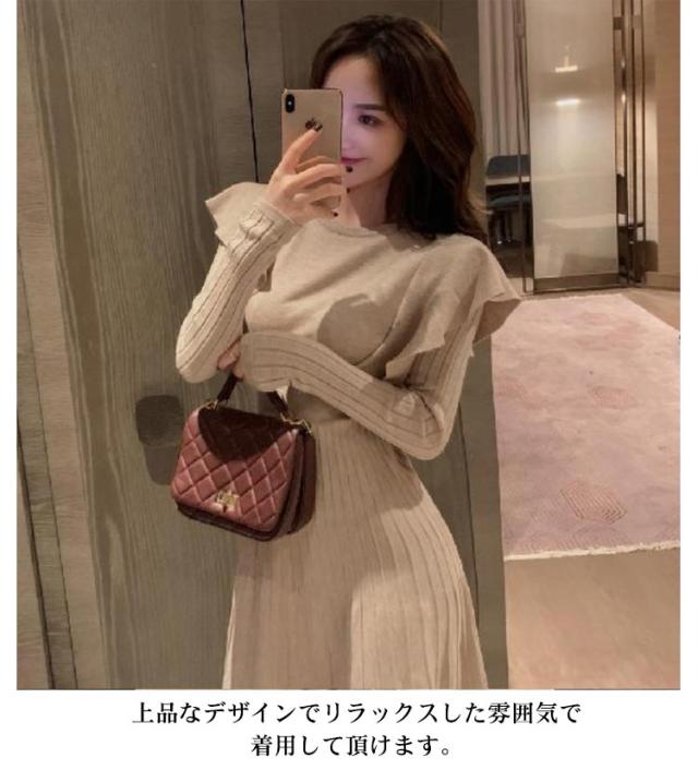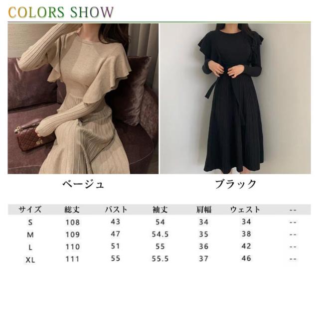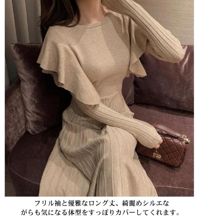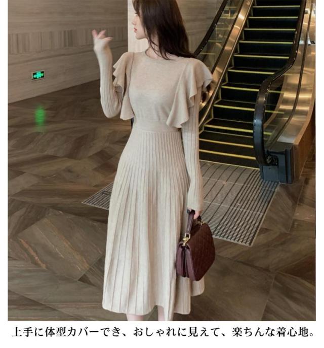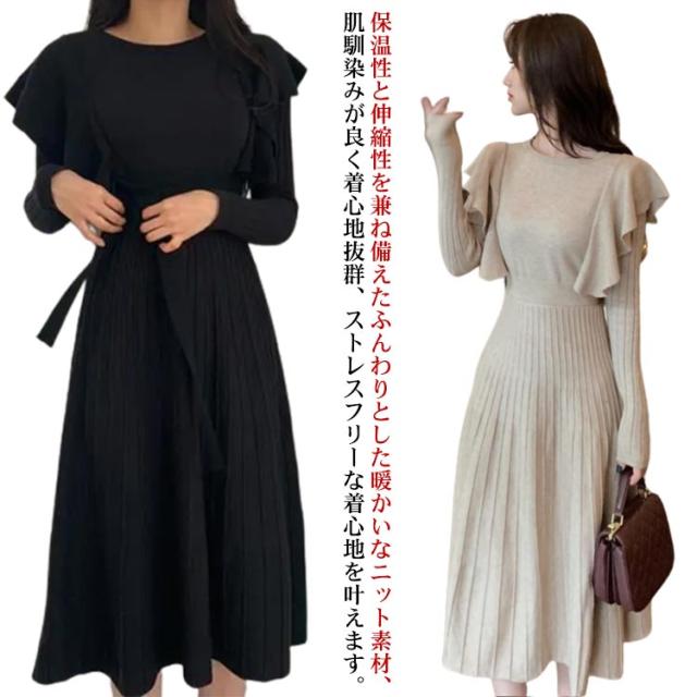 ニットワンピース ワンピース プリーツワンピース 長袖 お呼ばれ 秋 ひざ下丈 おしゃれ シンプル L 冬 春 オフィス きれいめ 無地 ワンピース エレガント 森ガール S M フリル袖
