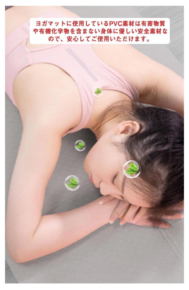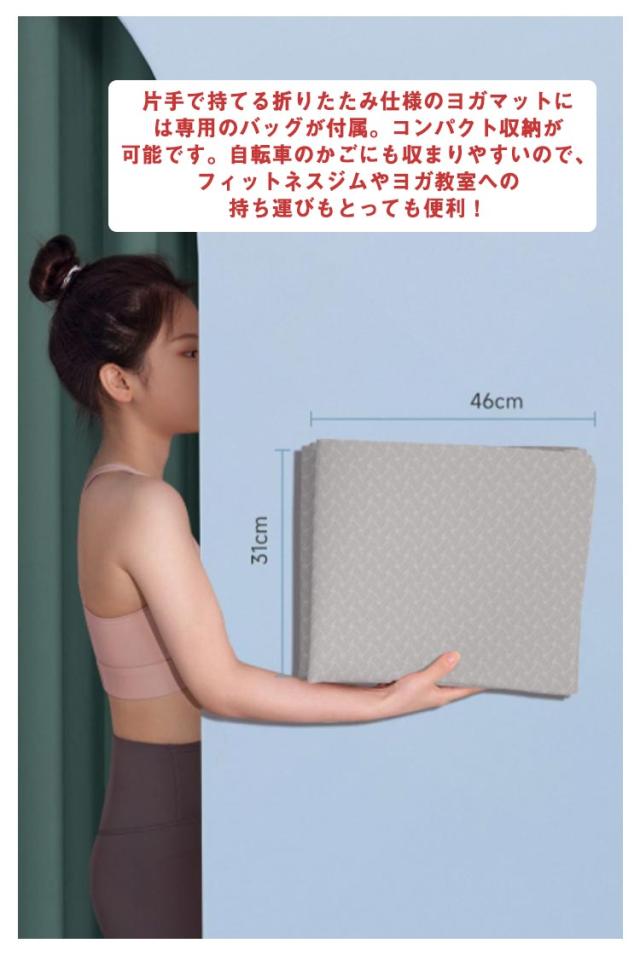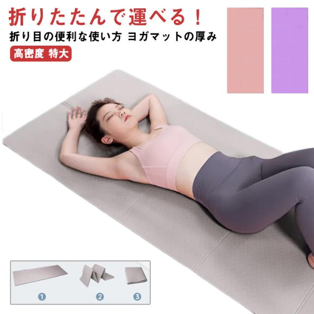 | 【折り目の便利な使い方】 ヨガマットの折り目を目視で綺麗に確認できるので、ヨガやエクササイズ中に姿勢や身体が平行になっているかチェックすることができます。体幹のトレーニングに最適! 【折りたたんで運べる!】片手で持てる折りたたみ仕様のヨガマットには専用のバッグが付属。コンパクト収納が可能です。自転車のかごにも収まりやすいので、フィットネスジムやヨガ教室への持ち運びもとっても便利! 【ヨガマットの厚み】4mm/6mm/8mm/10mmが選べます。抜群のクッション性で膝や背中への負担を軽減。ヨガマットに使用しているPVC素材は有害物質や有機化学物を含まない身体に優しい安全素材なので、安心してご使用いただけます。 | |