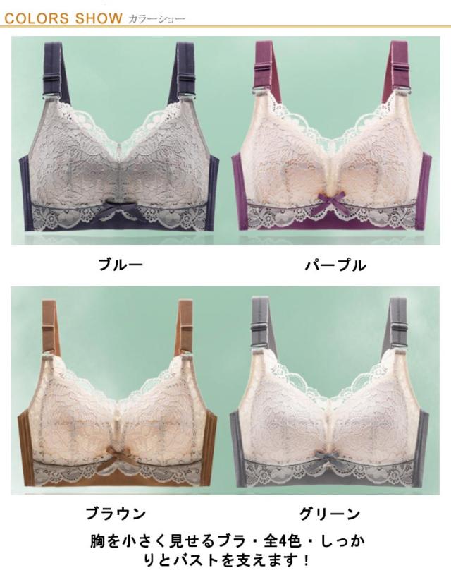| 胸を小さく見せるブラ・全4色・しっかりとバストを支えます! バストを覆うレースがしっかりホールド。 通気インナーカップ、吸湿排汗で蒸れない。 肩ひもを広くして滑りにくくする。 バストの高さを抑え、コンパクトに見せる。 360°丸め収納しやすい。 頼もしい4列4段ホック。しっかりとバストを支えます! U字のバックスタイルで肩への負担も軽減し、後ろ姿もすっきり! フロントや脇だけでなく、背中までしっかりホールド。後姿もスッキリ美人に! 胸より小さく見えるようにカップの膨らみは極限まで抑えながら、美しいバストラインを実現。 バスト全体をすっぽり覆い、広い範囲でホールドするので、下垂の原因となるユレも抑えます。 | |