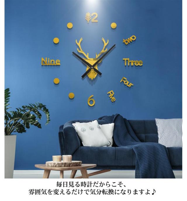| 壁やお部屋の大きさに合わせて自由に貼れるDIYウォールクロック。 ビッグサイズと鹿デザインが存在感たっぷりで、男前いインテリアにもバッチリのアイテムです☆ 配置も自由に!鏡面調の文字で高見え効果も抜群☆リビングに大きく飾るとかっこいいです♪ 毎日見る時計だからこそ、雰囲気を変えるだけで気分転換になりますよ♪ 静音設計なので、寝室でも安心してお使いいただけます。 | |