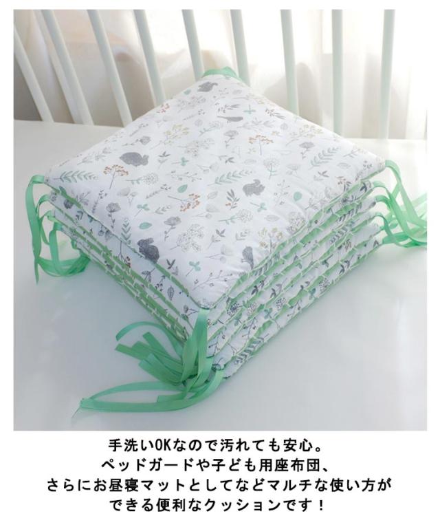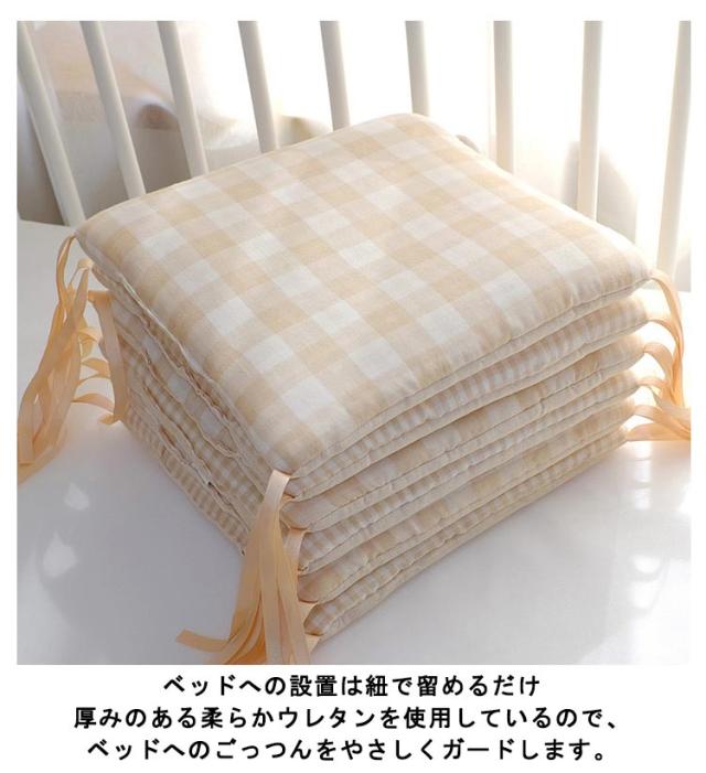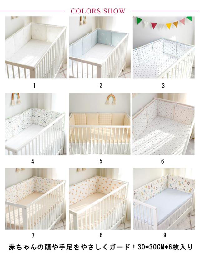 | 赤ちゃんの頭や手足をやさしくガード!30*30cm*6枚入り ベビーベッドの柵に赤ちゃんの頭や手足が当たるのをやさしくガード。 エアコンや扇風機、ヒーターなどの直接の冷風や温風から、赤ちゃんをやさしく守ってくれます。 カバーはやわらかくてふんわりサラッとした肌触りの綿カーゼを採用。 シンプルなプリントと優しい風合いが赤ちゃんをやさしく包みます。 ベッドへの設置は紐で留めるだけ 厚みのある柔らかウレタンを使用しているので、ベッドへのごっつんをやさしくガードします。 手洗いOKなので汚れても安心。 ペッドガードや子ども用座布団、さらにお昼寝マットとしてなどマルチな使い方ができる便利なクッションです! | |