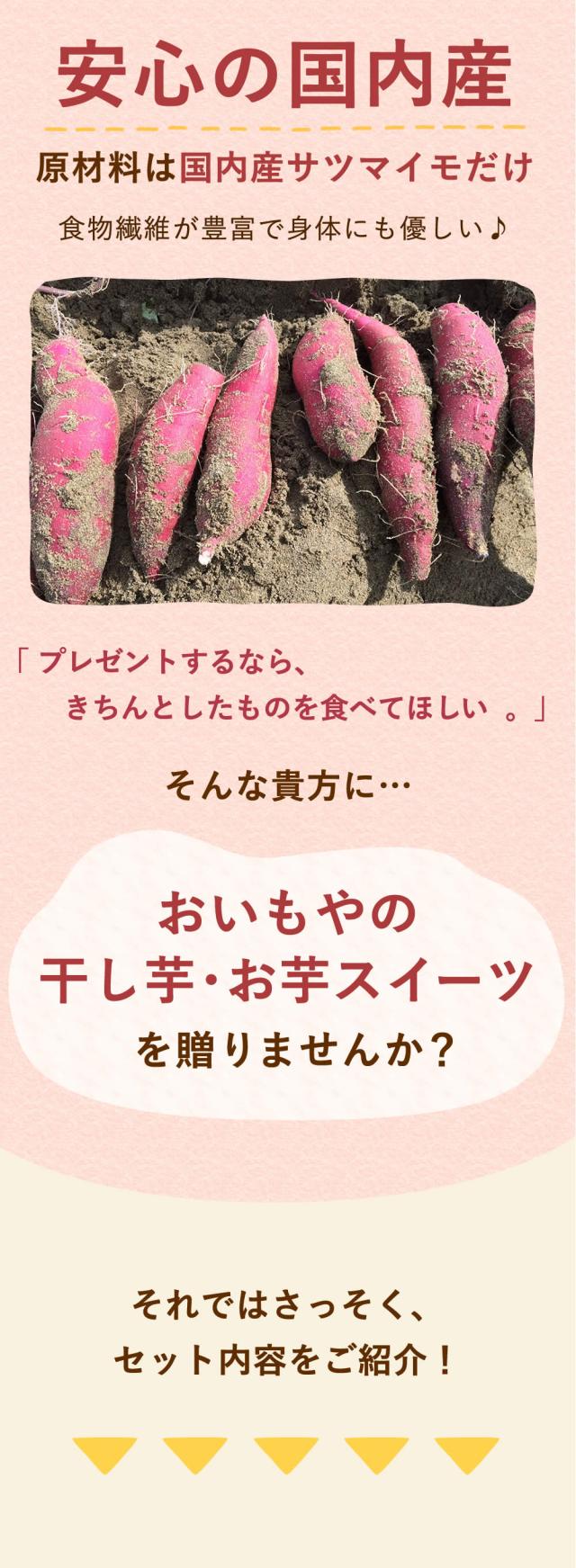 お菓子付セットでは、 和菓子・洋菓子の両方のお芋スイーツを楽しめますし、おいもやの無添加・無着色のほしいもは、 「グルメだけど、普段の食べ物から健康・美容にも気遣いたい」そんな場合におすすめな贈り物です。